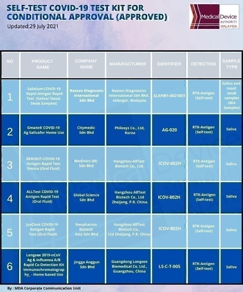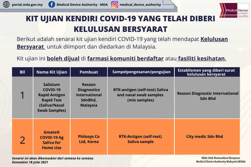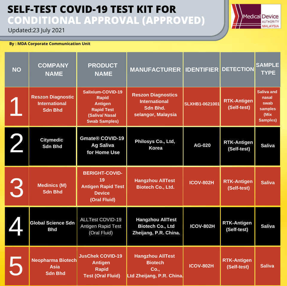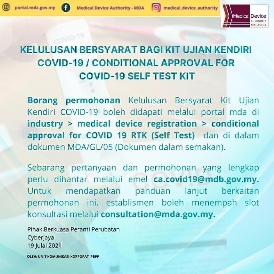 Self test covid 19 test kit conditional approval 29 Julai 2021